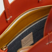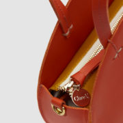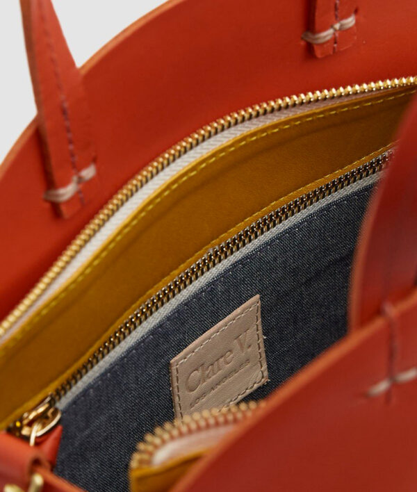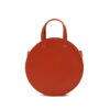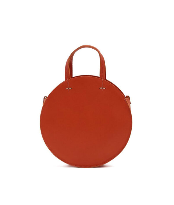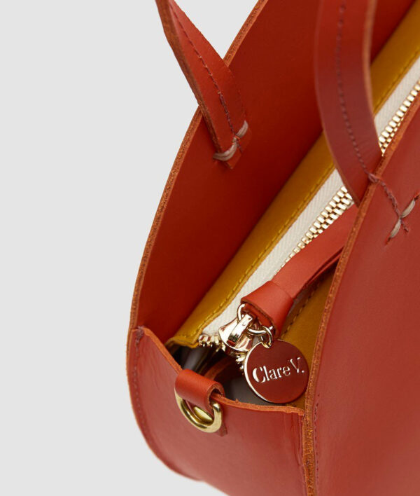 Modern circular shoulder bag from Clare V. Long-wearing vegetable-tanned cowhide. Top handles with topstich detailing; removable shoulder strap. Inset top panels in contrasting nappa leather; top zip closure with branded pull. Structured base. Single compartment with interior zip pocket. Gold-tone hardware. Leather logo patch at interior. Lined.